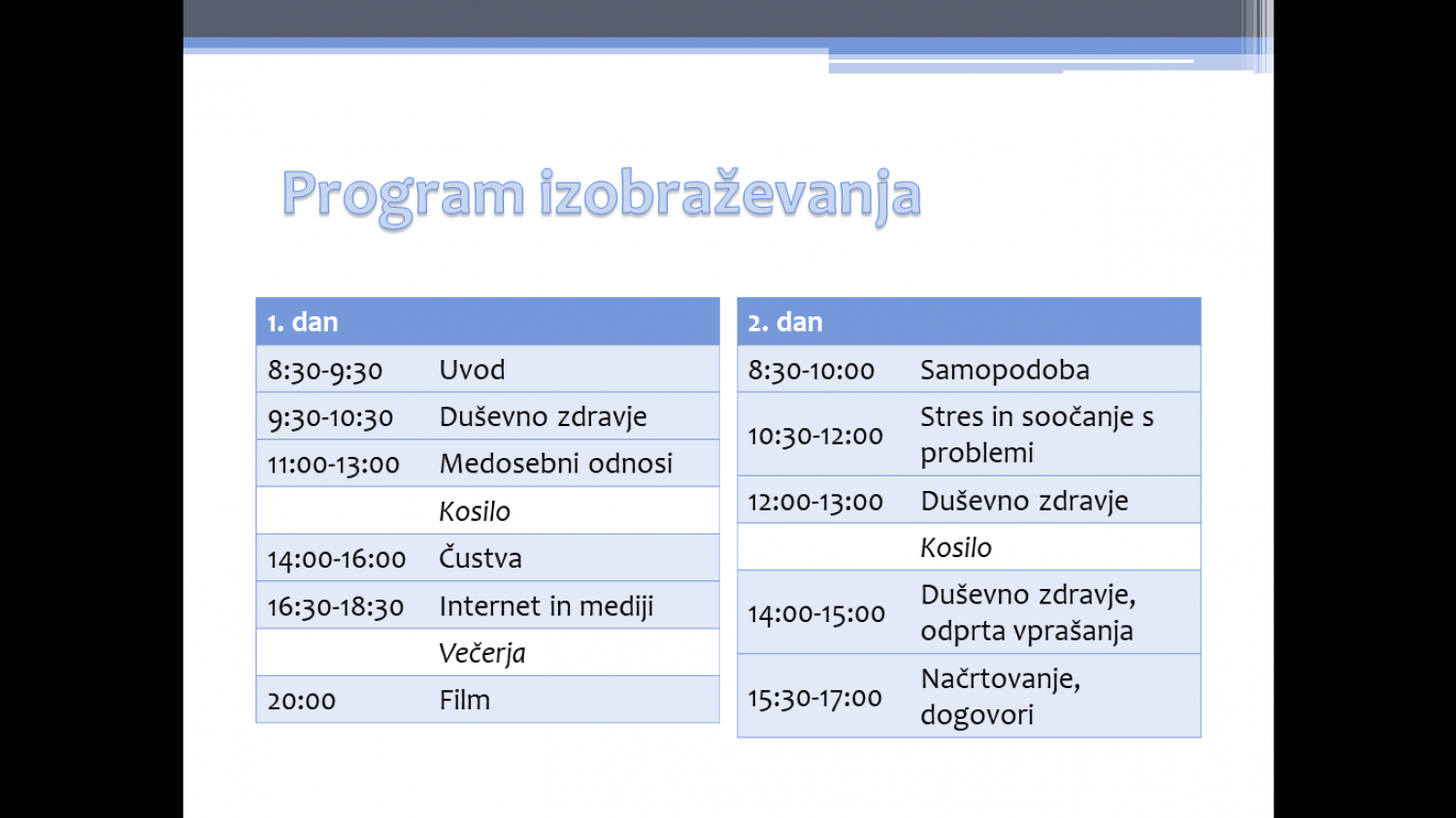 Okvirna vsebina 2-dnevnega usposabljanja: 6 področij duševnega zdravja --> samopodoba, čustva, stres in problemi, medosebni odnosi, internet in mediji ter tako imenovan presečni "meta pogled", kjer bomo obravnavali različne dejavnike tako tveganja kot preventive, ki jih moramo kot voditelji mladih imeti v mislih, veščinah in znanju.